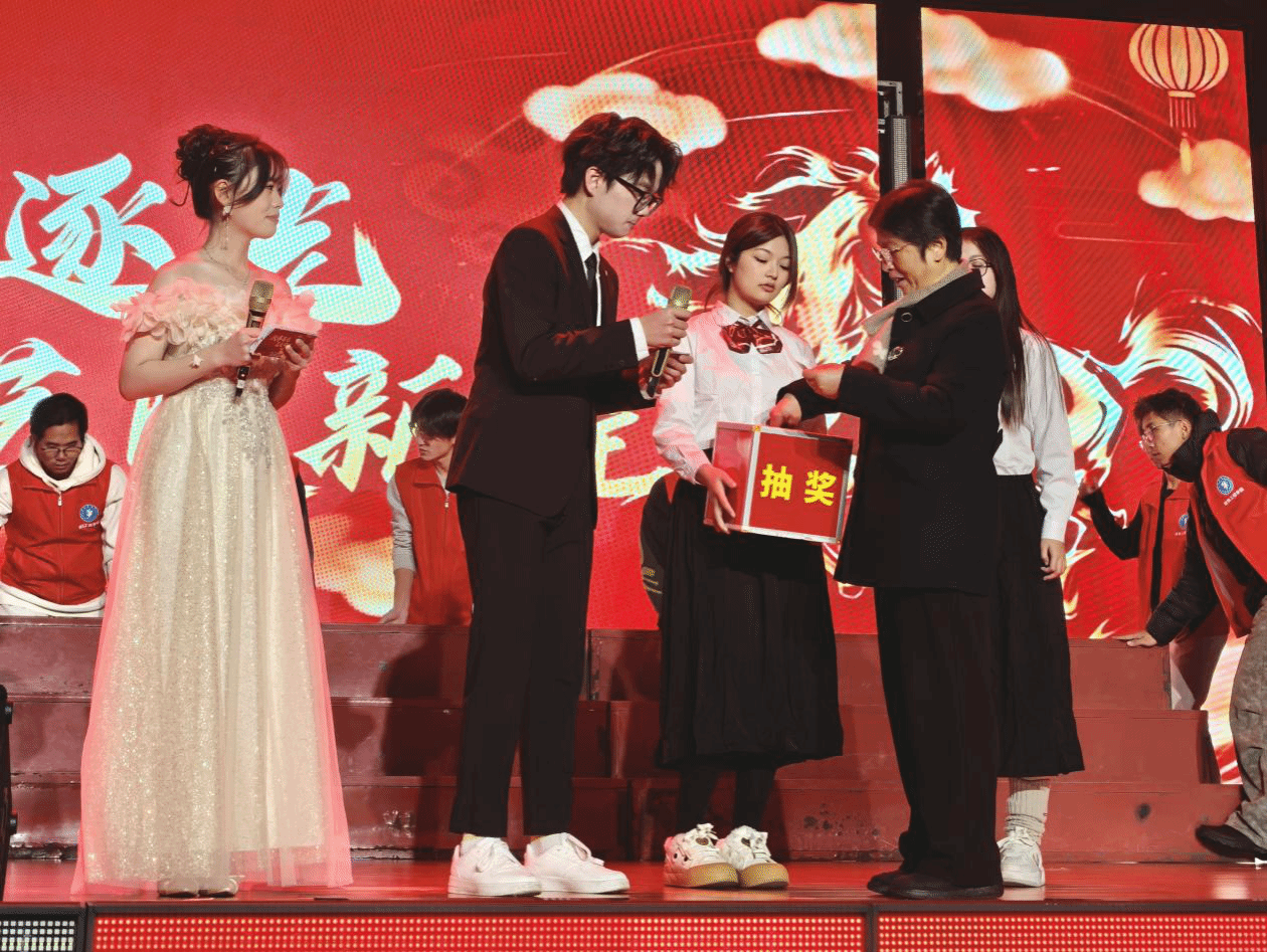 晚会在热烈欢腾的氛围中盛装启幕。活动现场座无虚席,观众们手持荧光道具,每遇精彩瞬间,雷鸣般的掌声与欢呼声便响彻全场,气氛热烈高涨。器乐演奏旋律悠扬婉转、意境悠长,时而轻快灵动,时而激昂澎湃,瞬间点燃了现场热情;原创歌曲节奏铿锵明快,律动强劲,尽显青春的动感活力,唱出了对未来的美好期许;舞蹈表演一颦一笑皆牵动人心,将晚会氛围推向高潮,炫酷的动作引得全场欢呼不断;小品表演笑点密集,幽默的台词和生动的表演让现场笑声连连,观众们纷纷拿出手机记录精彩瞬间。此外,激动人心的抽奖环节将现场气氛再次推向高潮。学院陈健书记亲自上台抽奖,依次抽取三等奖五名、二等奖三名、一等奖一名,让大家在享受视听盛宴的同时,收获一份意外惊喜。