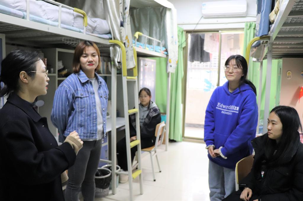 来到宿舍,辅导员们礼貌叩门,随后进入寝室内检查。老师们首先检查了宿舍内有无违规电器等物品,再仔细对地面、书桌、窗台等位置的卫生进行检查,同学们对被指出的问题进行了及时处理。借助这次检查,老师和学生们进行了深入的交流与沟通,了解同学生活上的困难与问题并帮助提供解决措施,切实拉近了师生距离,增进师生感情。在友好和谐的氛围下,本次宿舍检查划上了圆满的句号。