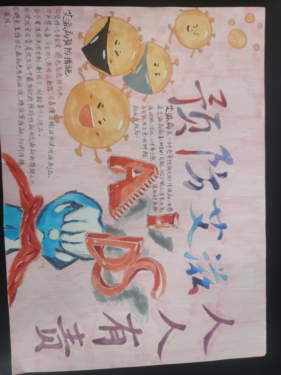 艾滋病手抄报大赛。本项活动以赛带教,影响深远。参赛同学充分发挥自己的创造力与想象力,在表达对艾滋病人的关心的同时,让更多的同学通过欣赏宣传画学到艾滋病的相关知识。