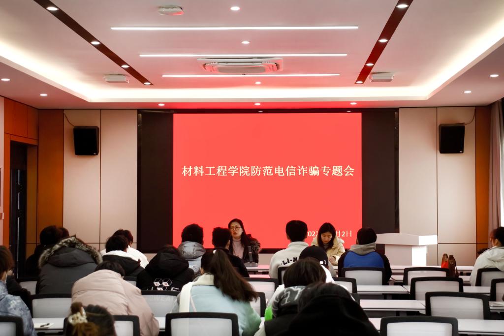 为有效提升同学们的防诈骗意识和反诈骗能力,切实维护学生的自身利益,12月2日,材料工程学院在知行楼A506会议室召开防范电信诈骗专题会,会议由材料工程学院党委副书记陈智慧主持,辅导员王亚男、各班班长参加。