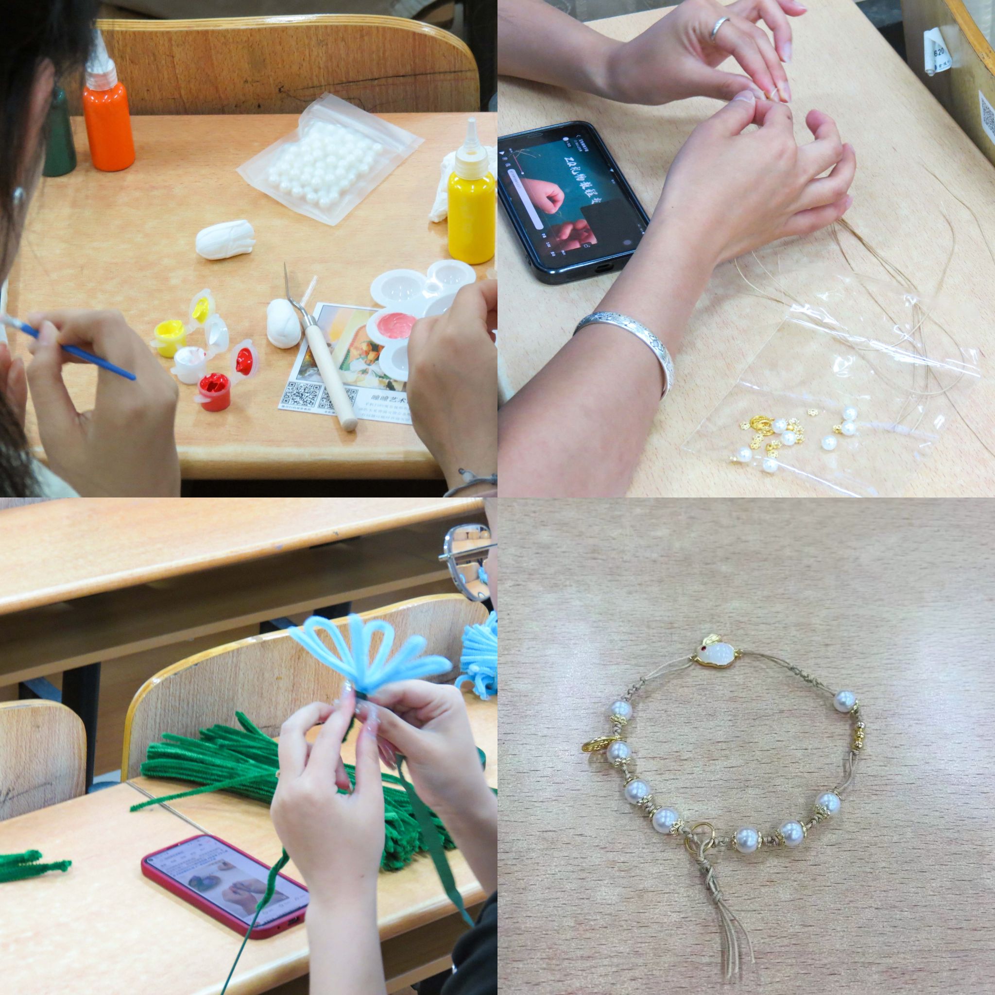 本次手工活动分为DIY小手链、手工花朵编织和3D郁金香立体肌理画共三个项目,形式多样、内容丰富,供每一位同学自由选择。大家选好项目后,纷纷拿起手中的原材料,跟着视频教程一步步操作,稍显复杂的步骤并没有难倒同学们,大家充分发挥自己的想象力,用耐心、细心、爱心,将一堆堆原材料变成一个个精美的礼物,将平日里羞于表达的爱意,通过这些手工制作的礼物化为对母亲最深情的告白。