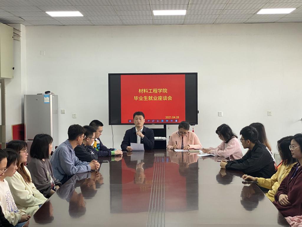 为充分了解毕业生就业选择和近况,为学生解答升学和就业相关疑问,材料工程学院于4月28日上午10:30在工科楼A504会议室开展21届毕业生就业座谈会。材料工程学院党委书记叶原丰、材料工程学院党委副书记陈智慧、毕业班辅导员王亚男出席本次座谈,21届毕业生代表参加。