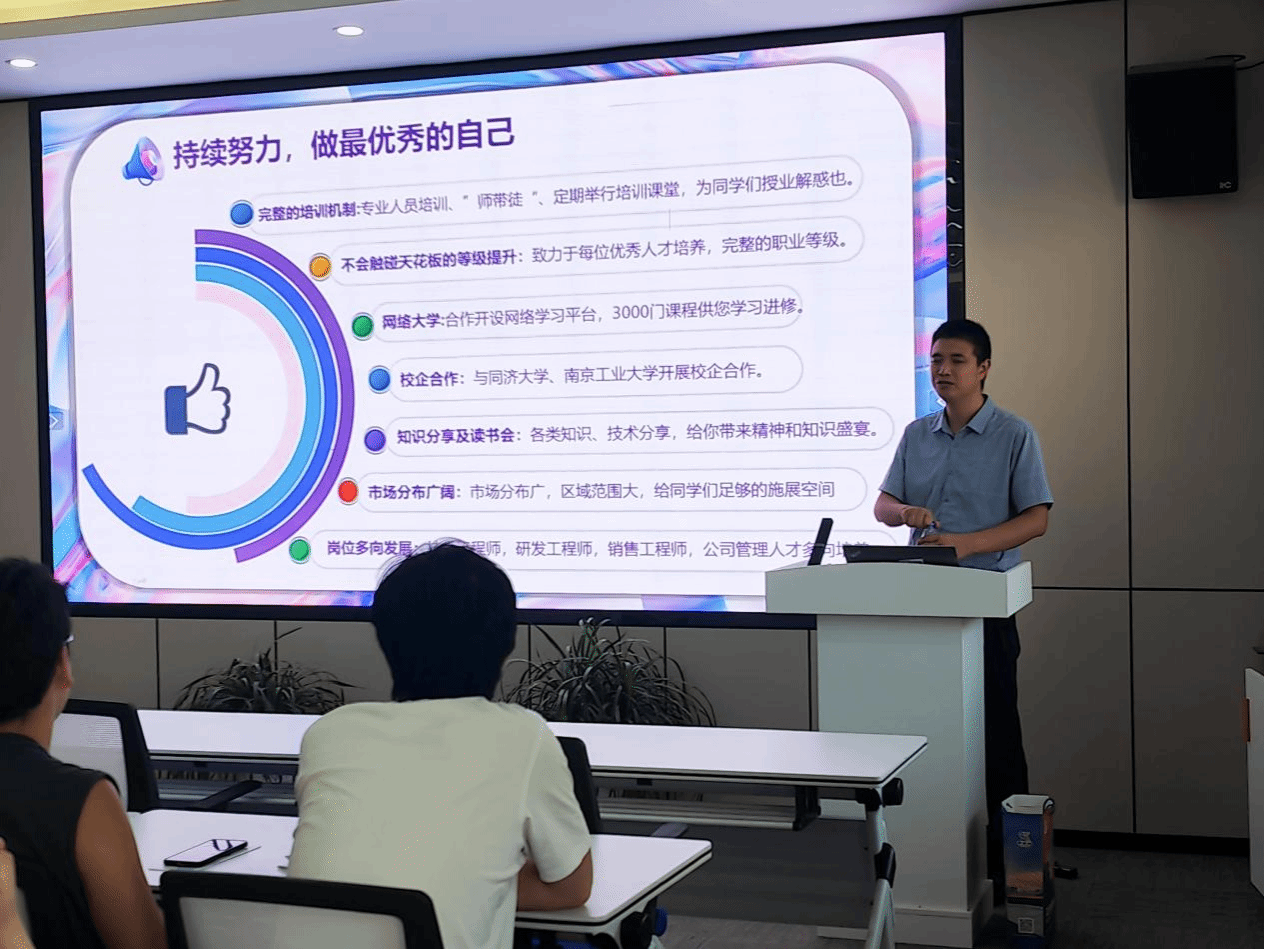 会议伊始,公司负责人付振华向同学们讲解了毕业生求职中的注意事项,从就业市场情况进行分析,鼓励同学们早规划、早行动,抓住就业关键期,尽快找到自我定位与就业方向。接着,付振华介绍了公司的现状、发展前景及多样化的岗位需求等,并解答了同学们关于专业岗位要求、企业对人才的实际需求、公司发展平台等方面的问题,为大家提供了针对性的就业指导和建议。