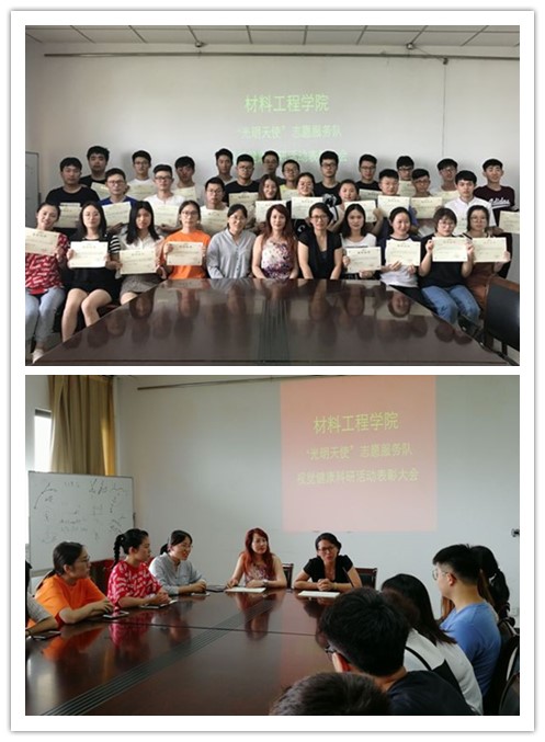为表彰在“进校园、走社区”视觉健康跟踪普查社会实践科研活动中表现优异的同学,材料工程学院于2018年6月5日在材料院工科楼会议室组织召开“光明天使”志愿服务队视觉健康科研活动表彰大会,材料院党总支副书记陈智慧、“光明天使”社团指导老师刘宜群教授出席会议,大会由材料工程学院团总支书记邱勤主持。