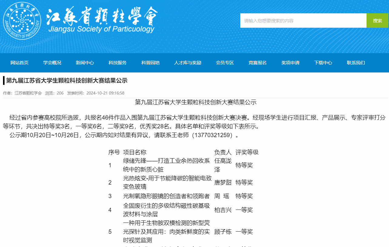 近日,第九届江苏省大学生颗粒科技创新大赛成功举行。本次大赛由江苏省颗粒学会联合江苏省环境科学学会、江苏省化学化工学会等主办,江苏城乡建设职业学院承办,共吸引了全省多所学校约500余人参赛46件作品入围决赛经学生现场项目汇报、产品展示、专家打分等环节,共决出特等奖3名、一等奖6名、二等奖9名、优秀奖28名。